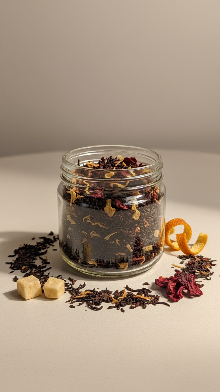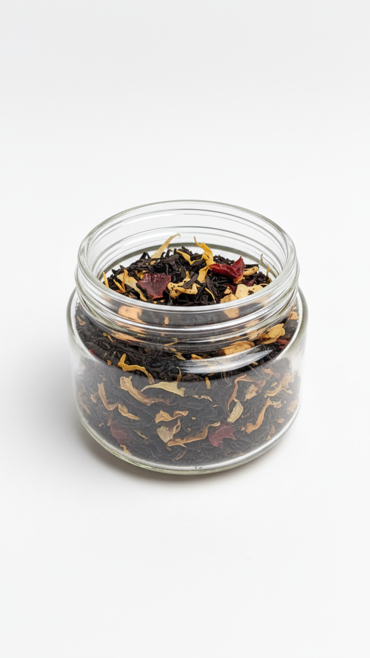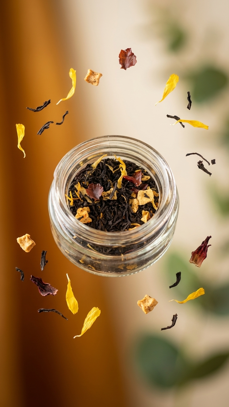 Ingredients: black tea, apple pieces, cocoa nibs, rosehips, butterscotch flavor, marigold flowers